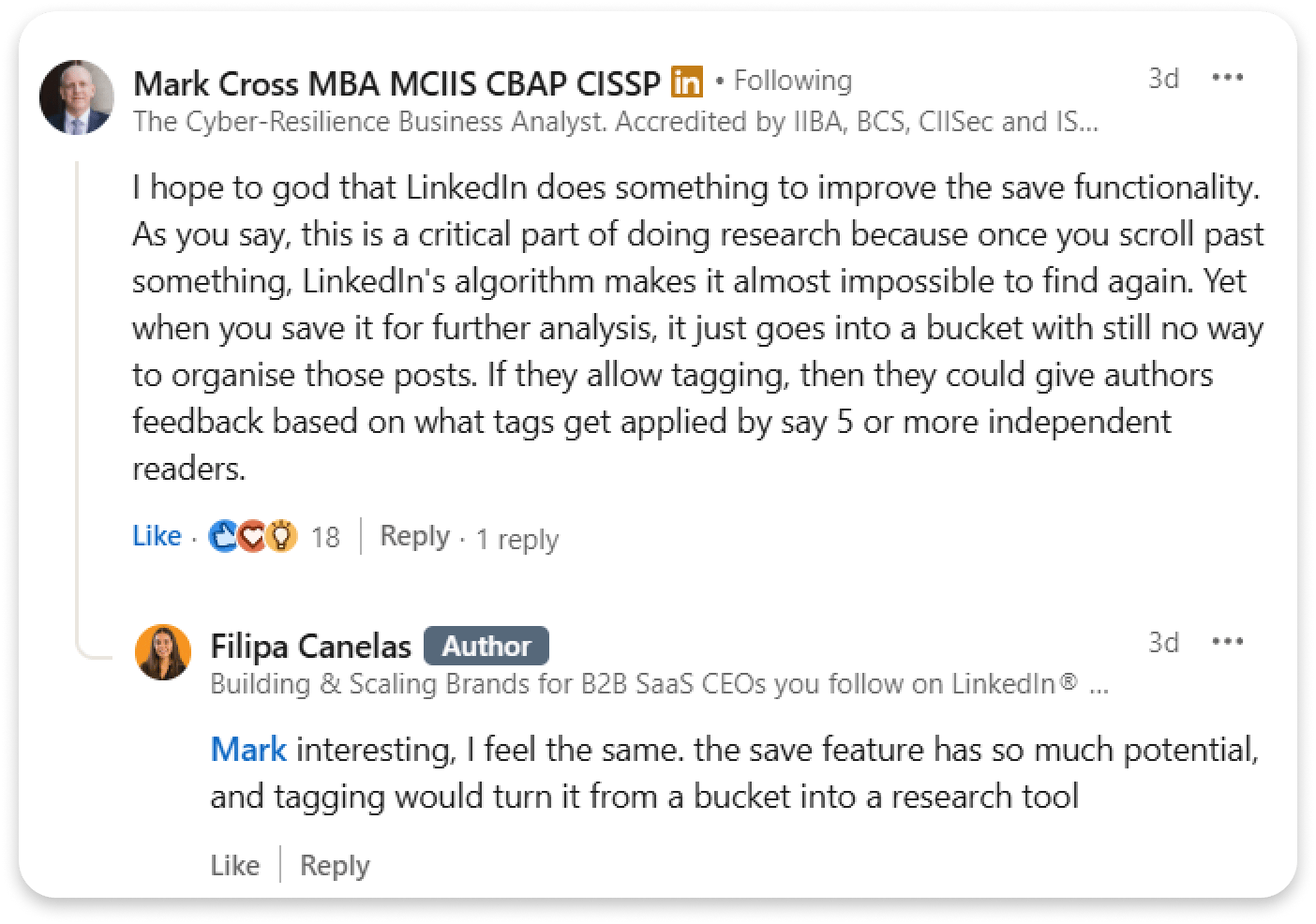 “Once you scroll past something, LinkedIn’s algorithm makes it almost impossible to find again. When you save it, it just goes into a bucket with no way to organise those posts. If they allowed tagging, it could be a game-changer.”